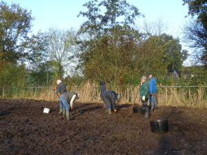 En eindelijk konden we op 26 oktober zelf aan de slag. Het weer werkte goed mee, onder een blauwe hemel werd begonnen met het verwijderen van allerlei wortelresten die door het frezen los waren gekomen. Ook werden de eerste paden aangelegd. Dikke jassen gingen al snel uit, er werd hard gewerkt maar gelukkig was er ook tijd voor een praatje, een geintje en een kopje koffie. Kortom, een heerlijke dag.