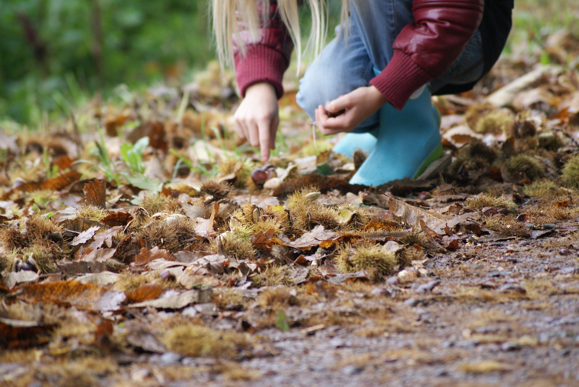 Kind speurt naar kastanjes tussen herfstbladeren op bosgrond.
