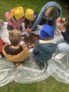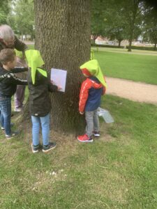 Ze hebben onder andere kleine kriebelbeestjes gezocht, een afdruk van de schors van een boom gemaakt en een regenworm over hun hand laten lopen. Ook hebben ze bij elke opdracht een huisje gezocht waar kabouters wonen. Een van de leerlingen uit groep 1 vraagt zich af ,als zij het huisje ziet ,waarom het licht niet aan is.