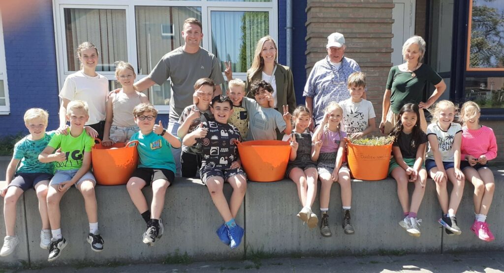Voordat de groep naar buiten ging, bezocht de wethouder eerst de klas. Op haar vraag waarom bloemen belangrijk zijn, wisten de leerlingen het antwoord meteen: “Voor de bijen en andere insecten!” Een les die ze de week ervoor van een imker hadden geleerd. De leerlingen mochten de wethouder ook vragen stellen. Een leerling merkte op dat zij als wethouder verantwoordelijk voor het groen in Oldenzaal mooie passende groene kleding aan heeft. Gezamenlijk hebben ze heel ijverig het bloemenlint gezaaid. Nu maar hopen dat het voldoende gaat regenen om de zaadjes te laten ontkiemen en de bloemen straks volop kunnen bloeien en daarmee bijen, vlinders en andere insecten van voedsel voorzien.