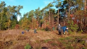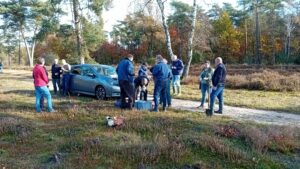 Met prachtig weer en aangemoedigd door overvliegende ganzen en langs stormende reeën werd de hei van ongewenste opslag ontdaan. In de pauze werd de koffie en thee voortreffelijk door Het Hulsbeek verzorgd, waarbij teven een energierijke traktatie niet ontbrak. Vol energie werd de opslag op diverse meedogenloze wijzen (uitspitten, afknippen, top omknakken) te lijf gegaan. Landschap Overijssel bood ons na afloop een handig tekenbestrijdingsmiddel aan: een fijn teken van waardering. Een zonnige en gezellige Natuurwerkochtend had ons aller zielen gesterkt.