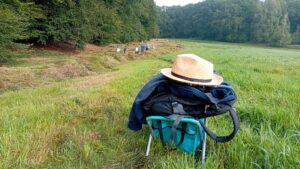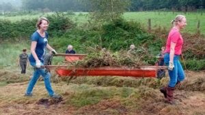 En onder de bezielende leiding van Marcel Meenhuis en Petra Hofhuis van Natuurmonumenten werd inderdaad prachtig werk verricht. De flinke regen van woensdag en het nabluswerk van Pluvius op vrijdag had het hooiwerk tot een extra pittige klus gemaakt. Vooral in de diepe stukken van de grote hel was het, zoals dat in een hel betaamt, duivels zwaar. Kijk, zulke omstandigheden zijn een extra motivatie voor de dappere dragers, die het hooi uit de diepten van de kleine en grote hel op draagbaars omhoog zeulden. En dat in een tempo waar de Alkmaarse kaasdragers nog een puntje aan kunnen zuigen. Behalve de duivels kwamen daarom ook nog de elven aan gefladderd: in de Elfterheurne was het smakelijke toetje van deze natuurwerkochtend.