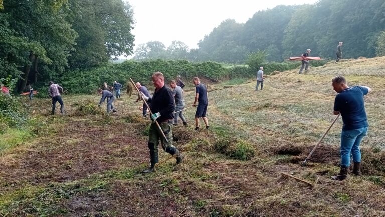 En onder de bezielende leiding van Marcel Meenhuis en Petra Hofhuis van Natuurmonumenten werd inderdaad prachtig werk verricht. De flinke regen van woensdag en het nabluswerk van Pluvius op vrijdag had het hooiwerk tot een extra pittige klus gemaakt. Vooral in de diepe stukken van de grote hel was het, zoals dat in een hel betaamt, duivels zwaar. Kijk, zulke omstandigheden zijn een extra motivatie voor de dappere dragers, die het hooi uit de diepten van de kleine en grote hel op draagbaars omhoog zeulden. En dat in een tempo waar de Alkmaarse kaasdragers nog een puntje aan kunnen zuigen. Behalve de duivels kwamen daarom ook nog de elven aan gefladderd: in de Elfterheurne was het smakelijke toetje van deze natuurwerkochtend.