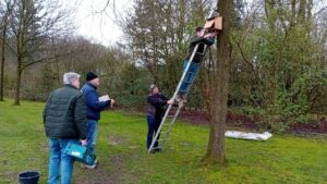 Maar niet alles loopt parallel aan Den Haag. Bij ons werd na een soepele groepsindeling het werk wel precies binnen de daarvoor ingeplande tijd uitgevoerd. Dit kwam mede door de als altijd weer uitstekende verzorging van het gereedschap door Fokke en het voorwerk van Dirk en de ondersteuning van Henny bij het plaatsen van de nestkasten. Het spreekwoord: je kunt van mij de boom in, kreeg een wat andere invulling. Met de nodige accuratesse werd de accuboor gehanteerd en de woningnood onder de vogels verholpen. De jonge vogels kunnen straks uit de kast komen. Hun rijkelijke vogelzang in de lente zullen we als een dankbaar loflied opvatten.