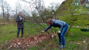 Soms zie je opeens van die parallellen. Zoals met de huidige politieke gang van zaken. Deze Natuurwerkochtend zou de naam van programnatuurwerkochtend met recht kunnen dragen. Op een afgescheiden plek in de Stakenboer werd onder leiding van informateur Felix Nijland een beknopt hoofdlijnenakkoord gesloten. Deze hoofdlijnen bestonden uit het ophangen van nestkasten, het vastzetten en schoonmaken van de bomenbordjes, enig snoeiwerk in de Vlinderhof en het snoeien van de hortensia’s.