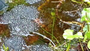We sloten op deze wijze een mooi seizoen van Natuurwerkochtenden af en gaan de lente in. Ook de kikkers in mijn vijver hadden zich aangesloten bij NL-Doet. Toen ik thuis terugkwam bleken ze een flink aantal klompen kikkerdril geheel vrijwillig te hebben gelegd en aan de foto’s is te zien dat tenminste een van de moeders de buik er nog vol van heeft: Lente in Twente, geniet ervan!