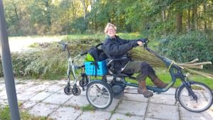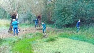 Onder een lekker zonnetje werd door een flink grote groep heel veel werk verzet. Het tempo lag dusdanig hoog dat naast de twee standaardpoelen ook een derde poel(tje) weer levenslicht kreeg. En dat je naast je rollator, je rugzak ook nog een bos wilgentakken mee op je fiets kunt nemen, bewees Mariska met een stralende lach.