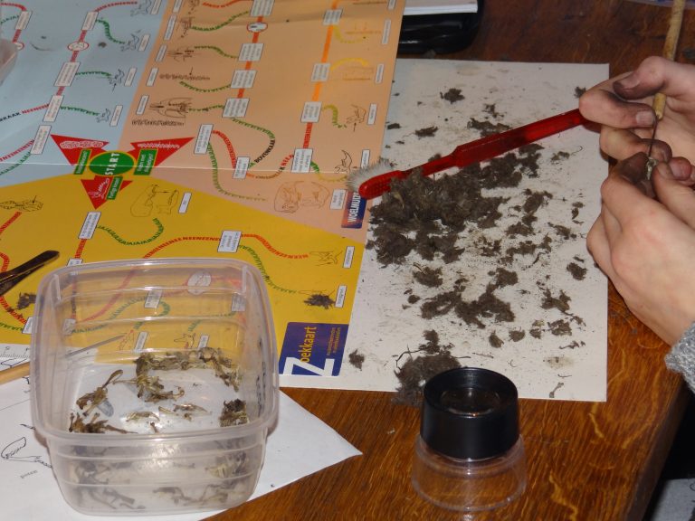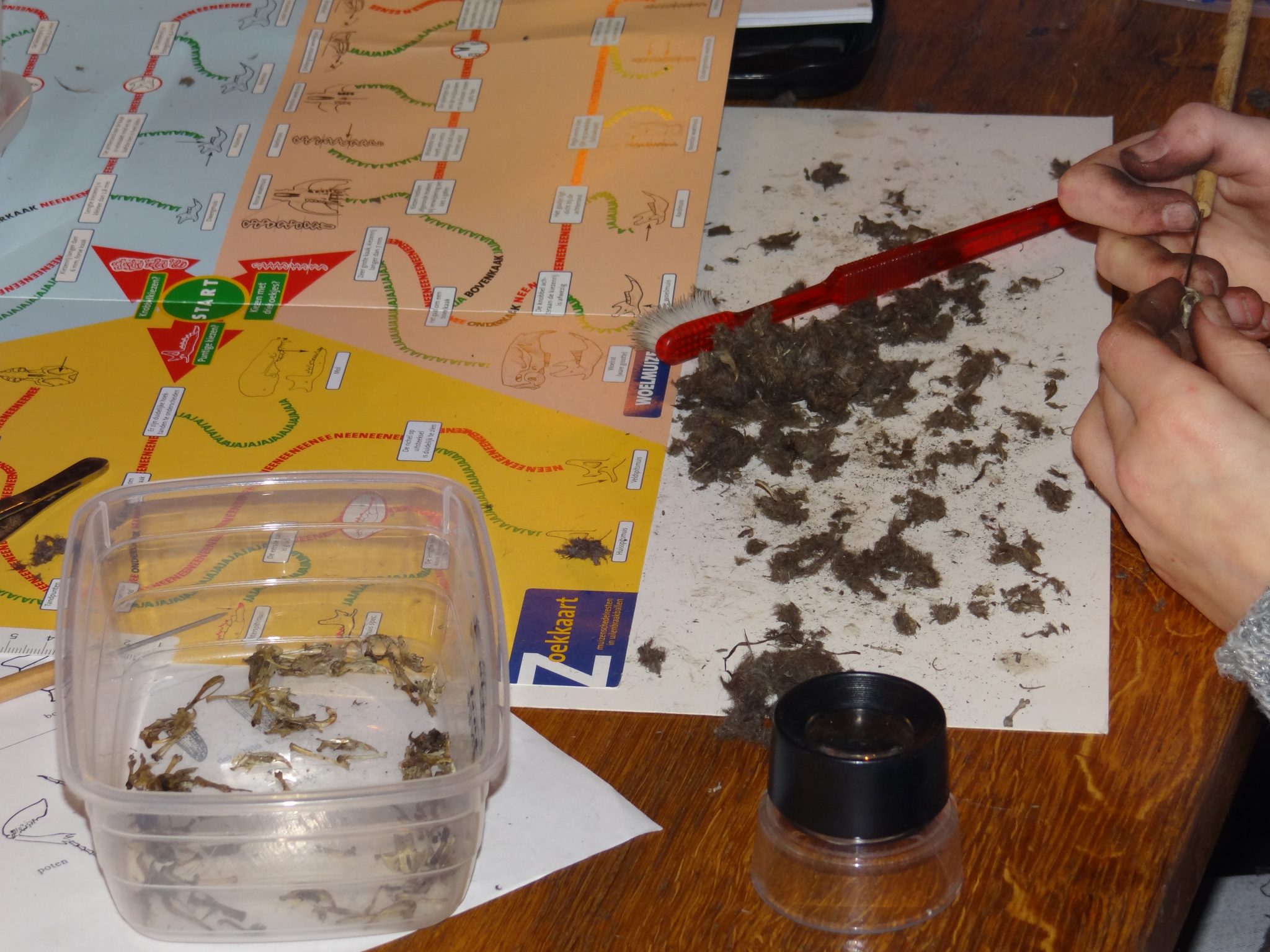 Persoon onderzoekt uilenbal op tafel met scheidingskaart, pincet en opslagbakje.