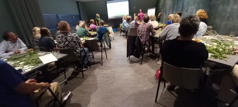 Het werd een boeiende, leerzame, actieve avond, waarin iedereen met veel plezier samen aan de slag ging. Ook gaven ze duidelijk aan dat je niet zomaar planten en bloemen moet plukken. Als ze op de rode lijst staan (zeer zeldzaam) mag het niet. En kijk om je heen, als er maar een paar staan, pluk ze dan niet, of zoek verder waar misschien een grotere groep staat.