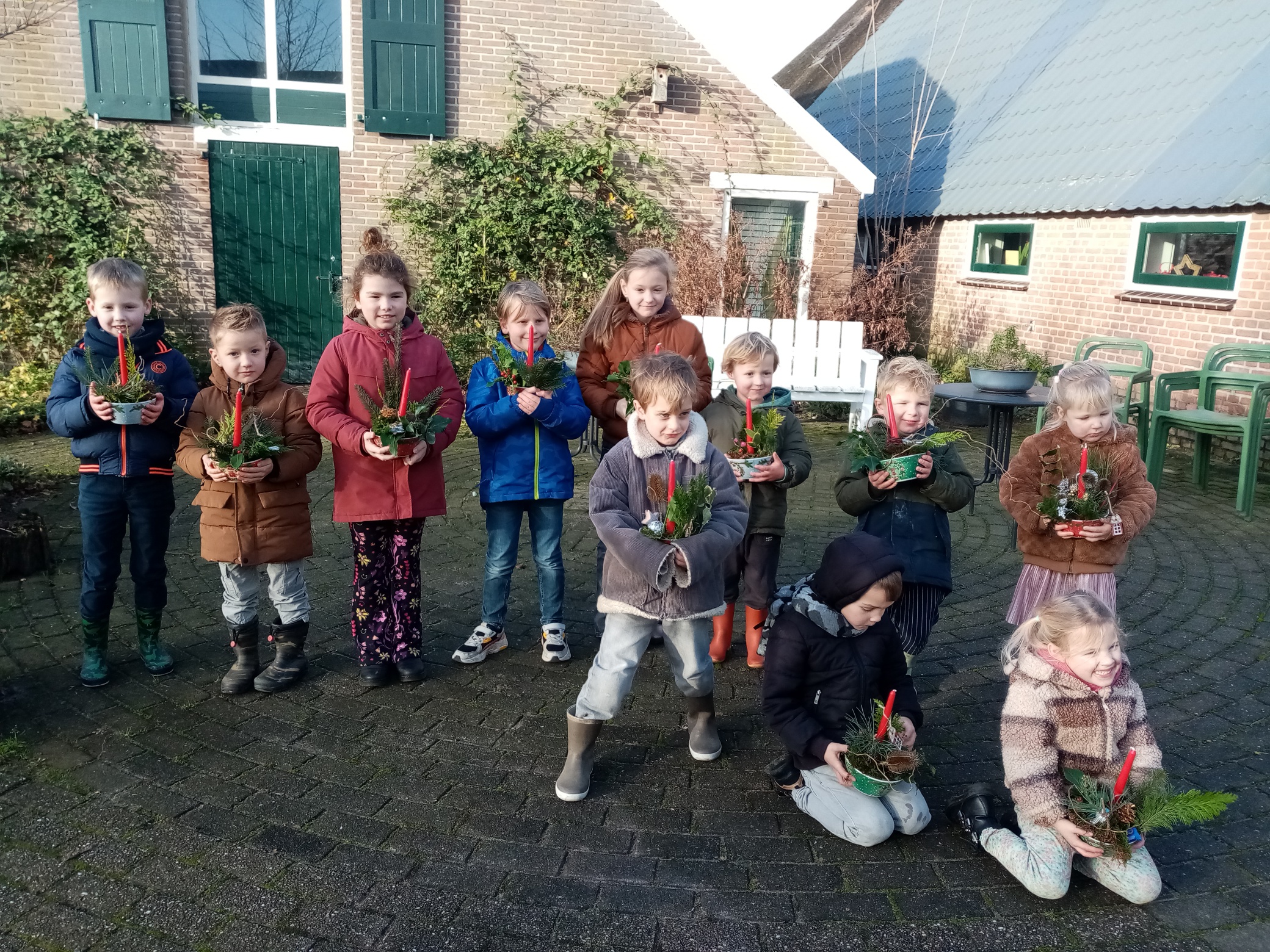 We begonnen met uitleg over de verschillende naaldbomen en een verhaal over de sparrenboom. Daarna ging iedereen aan de slag, met eerst zand en klei in een potje te doen en vervolgens allemaal verschillende takjes erin te steken. Ook werden de kerststukjes versierd met sterretjes, kerstmannetjes en zelfs met gouden dennenappeltjes. Het zag er allemaal heel mooi uit.