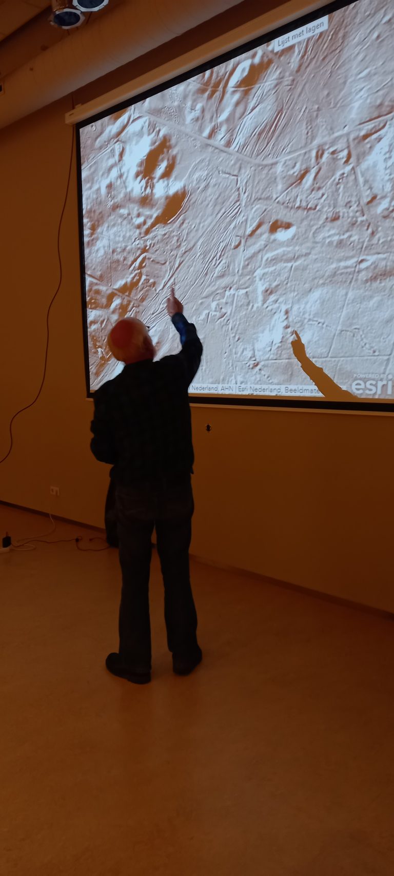 Verder was het bijzonder om te zien dat oude houtskool brandplekken in het landschap zichtbaar werden, of oude putten die ooit langs niet meer bestaande beken zijn gegraven. Dit alles is mogelijk gemaakt door de combinatie van veldwerk en kaartwerk, tegenwoordig van AHD (actuele hoogtestand van Nederland) maar ook wel met oude handgemaakte kaarten. Een mysterieuze plek op die kaart, waar de veldwerkers maar niets konden vinden, bleek een inktvlek op het origineel te zijn! Gert-Jan boeide zijn publiek met zijn diepgravende voordracht met mooie beelden en sloot af met een vraag aan de Wijhenaren. Langs de Raalterweg is een boerderij met ook zo’n zichtbare sleuf rond een bos. Weet iemand wat dat is geweest? Suggesties zijn welkom.
