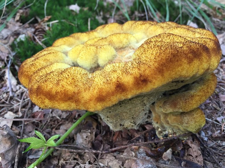Via paddestoelenkartering.nl kwam ik erachter dat dit een jonge Dennenvoetzwam blijkt te zijn. Het is een algemene soort die voorkomt op de wortels van Dennen en Fijnsparren. De soort veroorzaakt Bruinrot aan de boom.