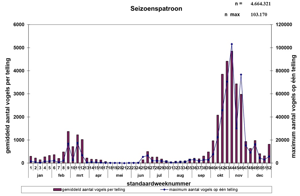 Uitgevoerde ochtendtellingen per jaar: totaal 3.076 waarvan 2.041 in het najaar. Uitgevoerde dagtellingen per jaar zijn in totaal 182. (Over het seizoen.) Op Trektellen.nl kan je de waarnemingen van de vogeltrek zien van Nederland. De trend is dat de vogeltrek gemiddeld iets toeneemt. Tussen de jaren 1975 en 2024 hebben we inmiddels ruim 5 miljoen vogels geteld. In het voorjaar zijn er veel minder vogels want er sterven er veel in de winter . In de herfst is het beter te tellen, dan in het voorjaar, ze hebben in het voorjaar ‘de wind in de kont’, zoals ze dat zeggen. Vogels vliegen dan boven de 100m, soms tot 500m hoger. Het mooiste tellen is met een briesje wind…Trekdrang is de natuurlijke instinctieve drang om seizoensgebonden te migreren tussen broed- en wintergebieden. Er zijn meestal 3-4 dagen ‘days of delay’ voordat ze vertrekken. (De vogels bepalen hun vertrek onder andere op basis van hoelang het licht is.) Er zijn allerhande aspecten die het tellen beïnvloeden: de dag- en nachttrek (‘s nachts kun je niet tellen, immers je ziet niks.. de Tjiftjaf vliegt ‘s nachts, dat is een nadeel voor ons.., maar ook de lijster ), thermiektrekkers; vlieghoogten; meewind en tegenwind en groepsgroottes . Dit alles geeft een totaal overzicht voor de ochtendtellingen.