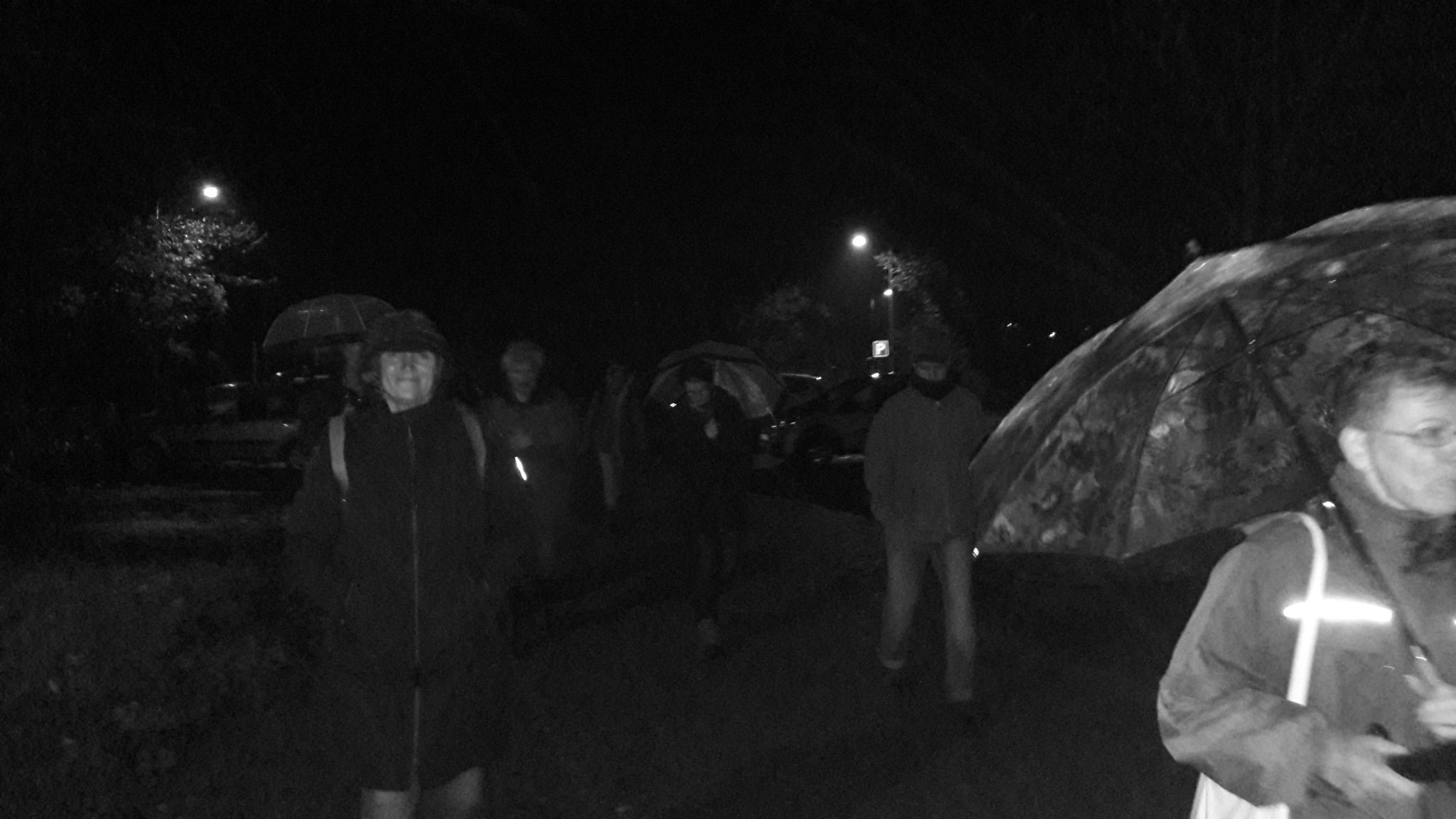 Met dank aan Wim en Johnny van de werkgroep Landschapsbeheer, die de regen trotseerden om de deelnemers deze opwarmer aan te bieden. We vervolgden het pad richting Huize de Kamp waar we vanuit het donker geleidelijk het licht weer inwandelden. Verlichte huizen, veel straatlantaarns en van duisternis geen sprake meer. Om 21 uur namen we afscheid van de deelnemers, die de regen trotseerden en deze avond met ons beleefden. Dank aan allen!