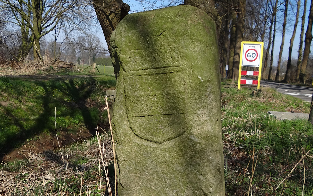 We gaan eerst naar grenspaal 788, de z.g. St. Vitus-steen. Deze fraaie steen draagt aan de voorkant het wapen van Gelre en aan de achterkant het wapen van Münster en erop gebeiteld is: