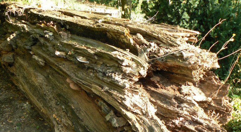 De rechter stam, deel van een zomereik, die in 2013 gekapt is, laat zien hoe dat proces begint. Wanneer een boom omgezaagd of omgevallen is en een tijd ligt, beginnen als eerste zwammen (paddenstoelen) zich te voeden met wat de boom hen kan leveren. Ze laten een web van fijne schimmeldraden – mycelium – de schors binnendringen en vormen met het voedsel dat ze daar vinden de paddenstoelen, zoals de elfenbanken, zwavelkopjes enz. die we vaak op dood hout vinden.