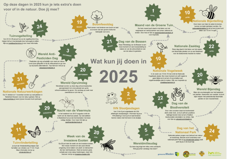 Er zijn veel verschillende en leuke manieren om de natuur een handje te helpen. Daarom hebben we (Werkgroep Vernatuurzamen) een Duurzame Kalender gemaakt met veel verschillende tips en suggesties om zelf in actie te komen. De ‘Duurzame Kalender 2025’ kun je hier gratis als PDF downloaden en zelf aan de slag gaan. Natuurlijk kun je jouw eigen ideeën hier nog aan toevoegen, graag zelfs!
