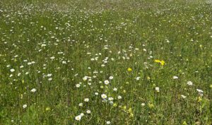 Een bloemrijke berm van de glanshaver-associatie. Gewone margriet en groot streepzaad in bloei.