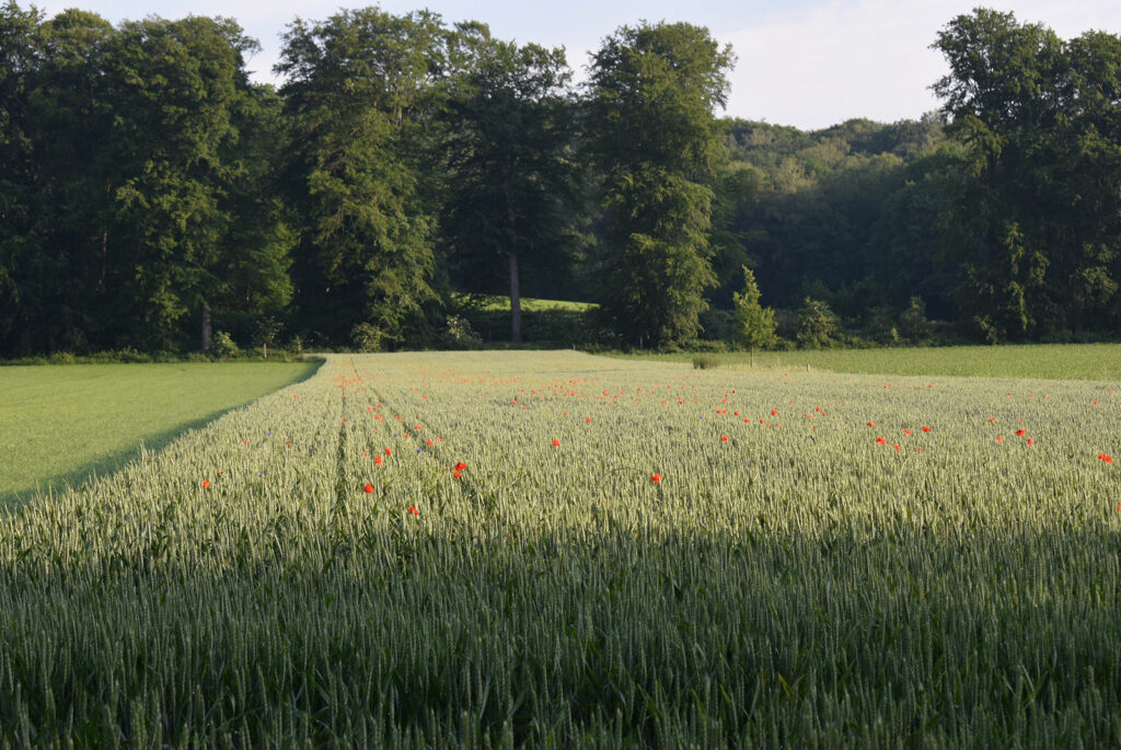 Over het gehele gebied genomen zien we al snel dat de ene akker de andere niet is. Percelen met de eeuwige maïs, aardappelen, peulvruchten, grasteelt en bloemrijke graanvelden wisselen elkaar af. Peulvruchten zijn vlinderbloemigen en de soorten uit deze plantengroep vormen, in symbiose met een specifieke soort bacterie, stikstofhoudende wortelknolletjes. Door de plantenresten met de wortels onder te ploegen, wordt de bodem vruchtbaarder; een eeuwenoude vondst die nog steeds goed werkt. De laatste jaren zien we de teelt van klassieke graansoorten zonder kunstmest, maar met bijmenging van typisch ouderwetse akkeronkruiden zoals klaproos, gele ganzenbloem, bolderik en korenbloem verschijnen. Het doel daarvan is een hernieuwde thuishaven voor bijen.