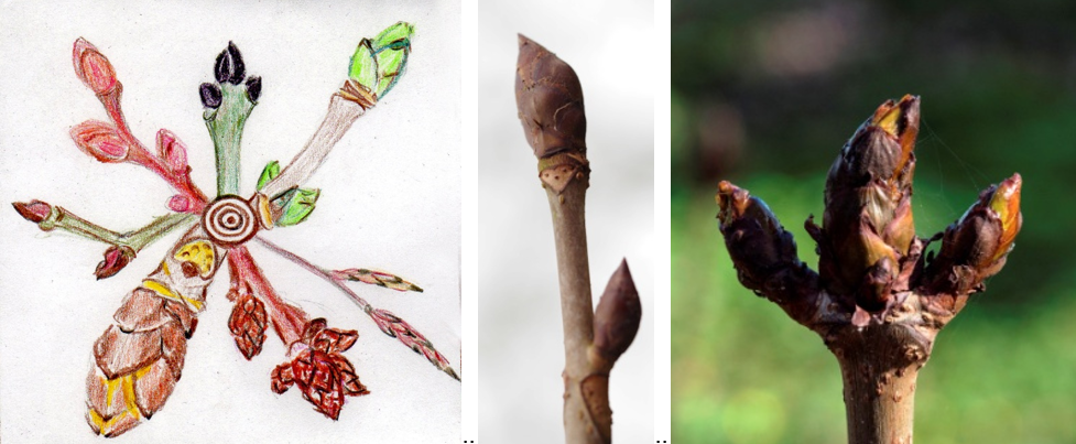 Op onderstaande tekening zie je bijvoorbeeld linksboven de rode knoppen van de lindeboom. De klok volgend zie je dat de es zwarte knoppen heeft en de esdoorn groene. Meerdere bomen hebben bruine of roodbruine knoppen. Dan kijk je bijvoorbeeld naar de vorm. De beukenknop is puntig, de knoppen van de zomereik zitten in een trosje, die van de paardenkastanje zijn groter en plakken. Kom je er nog niet uit dan kun je ook nog kijken naar de vorm van de tak, en de wijze waarop de knoppen aan die tak zitten: afwisselend rechts-links, of spiralend, of tweezijdig. En als ze dan tweezijdig staan liggen ze dan wel/niet tegenover elkaar? Kortom, er valt genoeg te observeren.