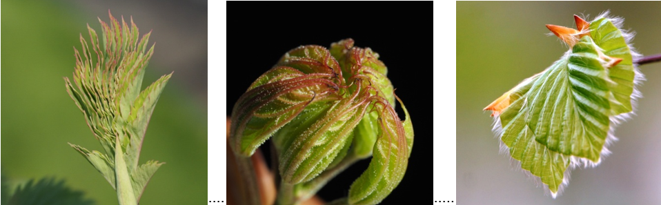 Op het moment dat de knop openbarst zie je hoe het pakketje zich uitvouwt. Het ene blad zit vol spikkeltjes, het volgende is behaard. Door goed te kijken leer je de bomen dan ook in die periode herkennen.