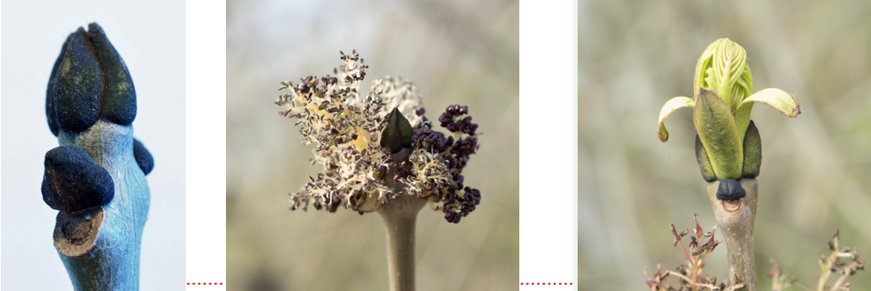 Je zult ontdekken dat de zwarte knoppen van de es (foto 1) bijna kunnen verdwijnen in de explosie van de mannelijke bloeiwijze (foto2), waarna dan uiteindelijk uit de zwarte knop de bladeren zich ontvouwen (foto 3).