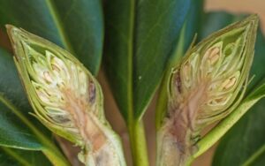 Vlak voor een knop uitloopt wordt deze groter. Dat kun je goed zien bij de knoppen van de paardenkastanje, waar de knopschubben glanzen en al wat losser zitten. Wanneer je zo’n knop doorsnijdt kun je een kijkje nemen in de inhoud van zo’n knop. Omdat veel knoppen nu nog te klein zijn om door te snijden zie je op de foto een voorbeeld van de bloemknop van de rhododendron.