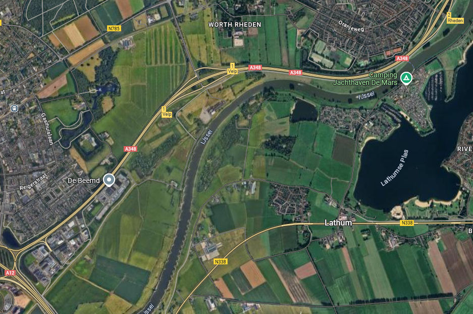 AFB: Velperwaarden (midden boven), ingeklemd tussen infrastructuur (A348, IJssel), recreatie (Rhederlaag, riverparc Lathum), bebouwing Arnhem/Velp/Rheden.