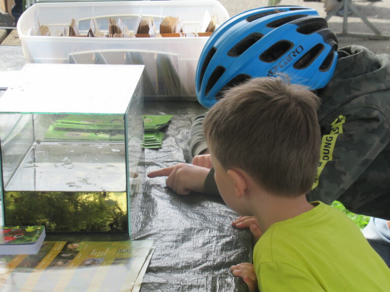 Vele kinderen kwamen prachtige natuurschilderijtjes maken dankzij de meegebrachte veren, blaadjes, droogbloemen, etc. Een aantal kinderen vond dit niet genoeg en gingen zelf nog bloemen e.d. plukken! De kinderen konden ook met modder en klei aan de slag om een zaadbommetje te maken. Velen kwamen kijken bij het aquarium met waterdieren uit de vijver en konden we meteen vertellen over de IVN slootjesmiddag. Zelfs de kleinsten herkenden al veel dieren, wat ook bleek bij het memoryspel met foto’s van dieren en hun kleintjes.