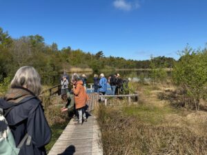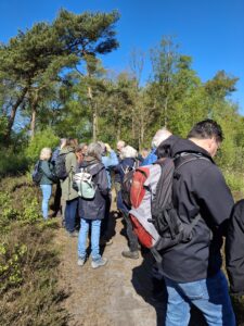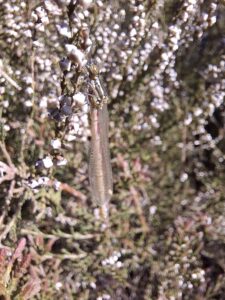 Terwijl we naar het water keken, zag Henk intussen al libellen vliegen. Een opvallende parelmoerlibel ging er eens goed voor zitten en werd door menigeen gezien. Heel speciaal was de vuurjuffer die we zagen in haar laatste metamorfose stadium: het uitsluipen. Het leek een onooglijk pluisje aan een takje heide, maar het scherpe oog van Henk zag deze verrassing van de natuur. Jan, de libellenkenner bij uitstek, herkende er – nu al- een vuurjuffer in (wat weten die mannen toch veel). Wat een mooie waarneming!