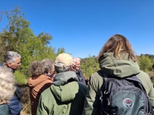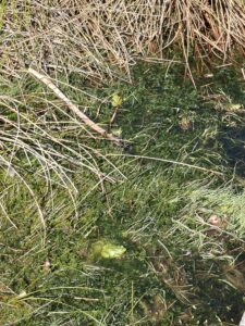 Inmiddels aangekomen bij de Catspoele werden we verzocht stilletjes te zijn, want wie weet zagen we de levendbarende hagedis toch nog in het zonnetje zitten. Jammer genoeg waren ze er niet. Maar in de natuur zijn altijd weer andere, opmerkelijke dingen te zien. In het water naast de vlonder bleken vele poelkikkers te zitten. Een vrij zeldzame soort, die het hier ‘goed doet’. En daar, vlak bij de vlonder was een nest van dodaars zichtbaar tussen het riet. Zo dicht bij deze uitkijkpost doet vermoeden dat dodaars inmiddels gewend raken aan mensen.
