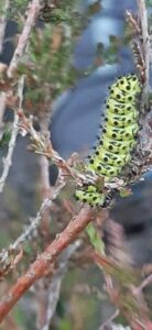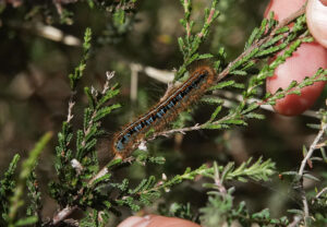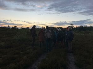 Na een korte inleiding van de gids gingen we op pad. Als snel hoorden we geelgorzen, boompiepers en zanglijsters nog het hoogste lied zingen. In de heide vonden we zeldzame rupsen waaronder de heideringelsrups en de prachtige rups van de nachtpauwoog. Onderweg naar de eerste stop hoorden we twee houtsnippen over vliegen die druk aan het baltsen waren. Aangekomen bij onze eerste stop duurde het niet lang tot de eerste triller over de heide rolde. Niet veel later zagen enkele deelnemers de eerste nachtzwaluw vliegen en vooral ook landen op een mooie dennentak. Iedereen kon zo de kenmerkende zithouding van deze mystieke vogel bewonderen.