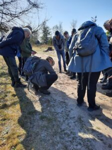 Spoorzoeken is het oplossen van een puzzel. Aaldrik vertelde over zoolgangers (das), teengangers (vos) en teenspitsgangers (ree). Aan de hand van beelden werden verschillen duidelijk. Toen we vervolgens sporen vonden en werden uitgedaagd deze te benoemen, maakten we allemaal dezelfde fout: meteen oplossingen zoeken. Vreemde rondjes in het zand…wat was dat? Oh, dat waren prikstokken voor het wandelen natuurlijk. Klaar. Aaldrik wees erop dat twee stappen verderop niks meer te zien was. Kijk eens om je heen, kijk omhoog…ach, het waren sporen van druppels condens die van de takken vielen. Even later, weer een spoor. Goed kijken, maar de groep besloot al snel dat het wel eens een eekhoorn kon zijn. Weer mis. Ook nu daagde Aaldrik ons uit om niet meteen een dier te benoemen, maar het spoor uit te pluizen: welke kant ging het uit, was het een vogel of een zoolganger, zag je nagels en voetkussens, etc. Hersens pijnigden zich om de theorie van dinsdag boven water te halen, tot Aaldrik vertelde dat dit pootafdrukken van een egel waren. Je verwacht geen egels in de zanderige duinen maar spoorzoeken is ook denken aan onmogelijkheden.