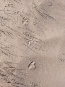 Het spoor van hele kleine pootjes intrigeerde ons. Het liep lang door, over een kaal stuk van de zandduinen. Het vertelde het verhaal van een heel stoer veldmuisje, die in zijn eentje dat hele stuk was overgestoken. Zonder schuilplek in de buurt. Die is erg dapper geweest.