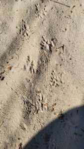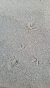 De pootafdruk van vogels vertelt op zich weer een verhaal over welke vogel het zou kunnen zijn. Zo zagen we een heel mooi spoor in het zand wat al krinkelend zijn weg vond. Drie tenen voor, een grijpteen achter. Dit was van een vogel die op een tak kon zitten, daar had hij immers die achterteen voor nodig. Een zwarte kraai konden we concluderen. Maar verderop was een spoor van ook weer drie tenen, maar zonder achterteen. Dat was best een puzzel. Je staat midden in het bosgebied, hier zitten toch alleen boomvogels?? We kwamen uit op strandvogels. En ja, de kleine plevier blijkt hier een plekje te hebben gevonden. Puzzel weer opgelost.