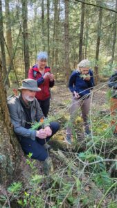 Maar wij, als liefhebbers, lekker wandelend in de natuur willen gewoon wat meer weten over hetgeen je ziet. Aaldrik wees ons erop dat je in een bosje met jonge boompjes vaak dode takken ziet. Het blijkt dat reeën hun gewei daar tegenaan schuren om te markeren of gewoon omdat ze jeuk hebben, met als gevolg dat de bast eraf gaat. En kijk, daar tussen de bomen is al het mos omgewoeld. Meteen riepen we: dassenwerk, of krabbende reeën.