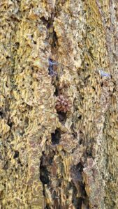 Toch zag het er anders uit. Puzzelen dus. Zag je snuitputjes in de grond, nee. Das viel af. Zag je open plekken van het krabben, nee. Ree doorgestreept. We kwamen uit op een merel die het loswoelen van mos tot ware kunst verhief om zo voedsel te vinden. Veel sporen hebben overigens die aanleiding: zoeken naar eten. Dieren graven gaten op zoek naar bodemdiertjes. De grote bonte specht pikt in basten van bomen voor voedsel. Dat is wel een slimmerd, want hij gebruikt ruwe basten ook om er sparrenkegels in vast te klemmen. Handig om vervolgens de kegel leeg te snoepen.