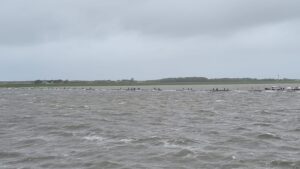 Windkracht 6-8 werd er voorspeld voor de Wadden. Al snel bleek dit geen loze waarschuwing. Terwijl de boot het eiland naderde, zagen we de eilandgangers die de boot terug moesten halen op hun fietsen tegen de wind in ploegen. Vanuit de verte leek het net of ze over het water reden, een waar Mozespad over de pier.