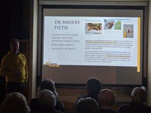 Hoe gaan wij om met wespen? Zijn ze leuk of lastig? In de volle zaal heerste een mengeling van grapjes maken en lacherigheid tot medeleven. De natuurliefhebbers waren afgekomen op een lezing over wespen, van de wespenstichting Nederland. Sjoert Fleurke heeft ons deze avond laten kennismaken met niet één, nee, talloze verschillende wespen.