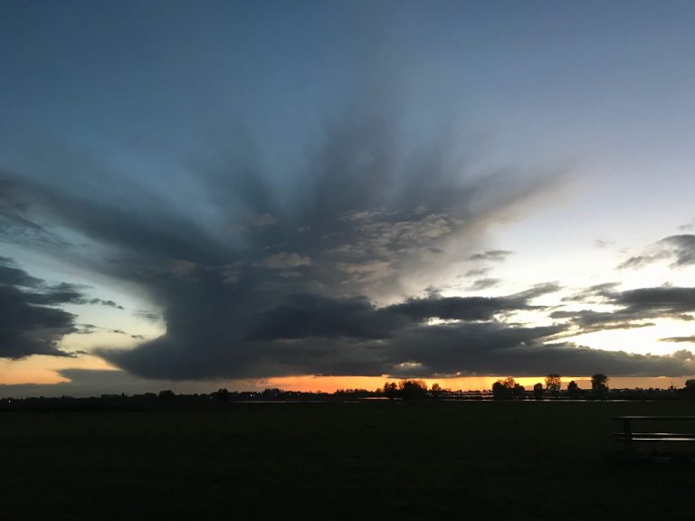 Avondlandschap met dramatische wolken en oranje horizon bij een ondergaande zon.