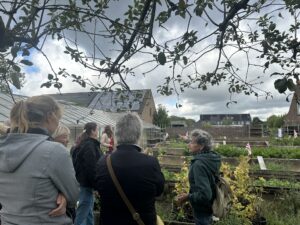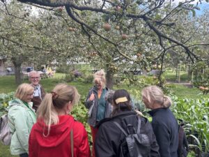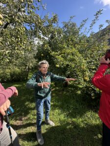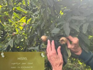 Na de Koffie werden we rondgeleid door een vroegere IVN gids van IVN RijnWaal, Maria van der Sanden. Ze is in Lent geboren als tuindersdochter in een van de vele tuinderijen waaruit Lent vroeger bestond (Lentse warmoezeniers). Je merkte wel dat het moeilijk was voor haar om te zien hoe alles is verdwenen en heeft plaatsgemaakt voor nieuwbouw, uitbreiding van Nijmegen. Ondanks dat ze een deel van de boomgaarden moesten inleveren is een groot deel van deze tuinderij bewaard gebleven. Maria vertelde vol passie over de verschillende gewassen en teeltmethoden van vroeger. Er stond bv snijbiet, een historische groente, die vroeger warmoes werd genoemd en waar de naam ‘Warmoes’ dus vandaan komt. We passeerden tijdens de wandeling door de tuin veel hoogstambomen met oude fruitrassen (vb De ‘Lentse roode’ is een handappel, en het ‘Lents witje’ is een pruim). We zagen kweeperen, kweeappels en een mispelboom. Onze gids hamerde er meermalen op dat we niet achter anderen moesten aanlopen maar zelf vooral initiatieven moesten nemen om de natuur te beschermen en de biodiversiteit te verbeteren.