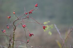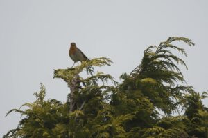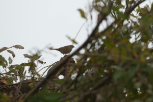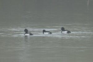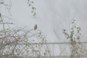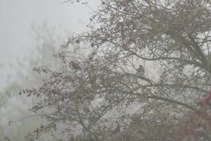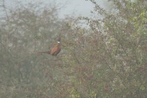 Het was mistig en bijna windstil. Dit gaf soms een wat mystieke sfeer tijden de wandeling. Ook hoorden we weinig vogels in het begin, waardoor het ook nog soms heel stil was. Best heel mooi, maar het weer was wat minder voor de fotografen. We hadden veel kramsvogels en koperwieken verwacht, maar kregen er pas meer te zien tegen het einde van de tocht. Bessen volop zou je zeggen. Ben zei dat er op de wadden nog heel veel kramsvogels en koperwieken waren, en daar waren ze blijkbaar nog niet uitgegeten. Uiteindelijk toch nog 30 soorten gezien. Behoorlijk wat watervogels; aalscholver, krakeend, kuifeend, wintertaling, zaagbek, fuut, zilverreiger en blauwe reiger, en ganzen. Op veel plekken waar we langskwamen verscheen er een roodborstje, deze zijn altijd nieuwsgierig. Erg leuk waren 2 appelvinken, wel ver weg voor een goede foto en leuk was ook een fazant die op een struik ging zitten.