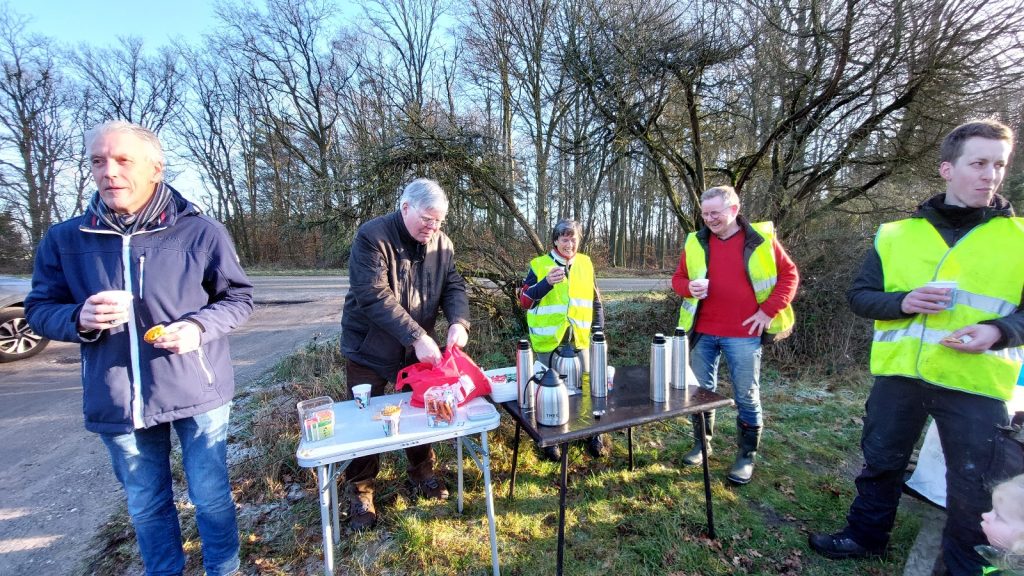 Rond 10.30 uur was er koffie/thee en een lekkere koek. Een klein groepje had pech, want die werkten aan het eind van het terrein en toen zij op de parkeerplaats kwamen was de koffie helaas al op. Gelukkig was er nog wel thee.