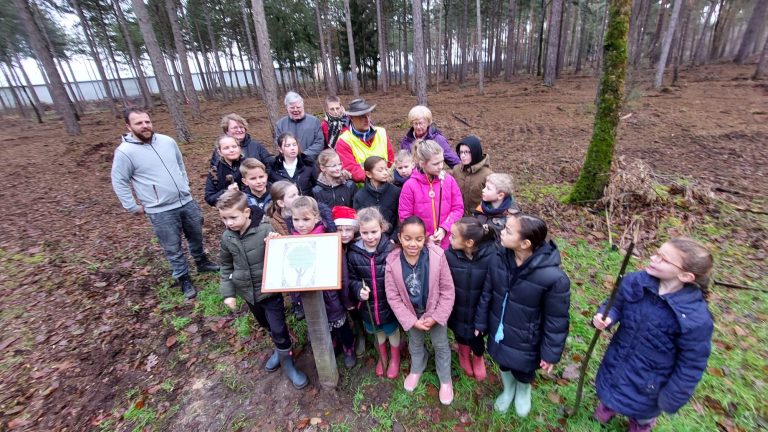 We lopen naar de rand van het bos waar een paal staat met een vuilniszak erover. Daar legt Marcel uit dat we vandaag geholpen hebben om de natuur te redden, want we hebben bomen nodig om te leven. Dan gaat de vuilniszak weg en wordt een mooi bord onthuld waarop staat dat wij dit bosperceel hadden aangeplant.