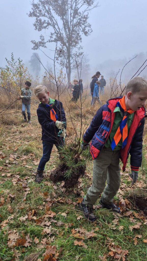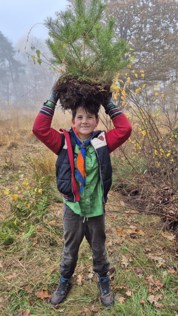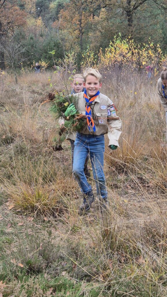 De Welpen gingen ondertussen aan de slag op de heide om opslag van jonge boompjes, meest berk en den, te verwijderen. Dat ging super. In ruim 1,5 uur werden een grote hoeveelheid boompjes verwijderd.