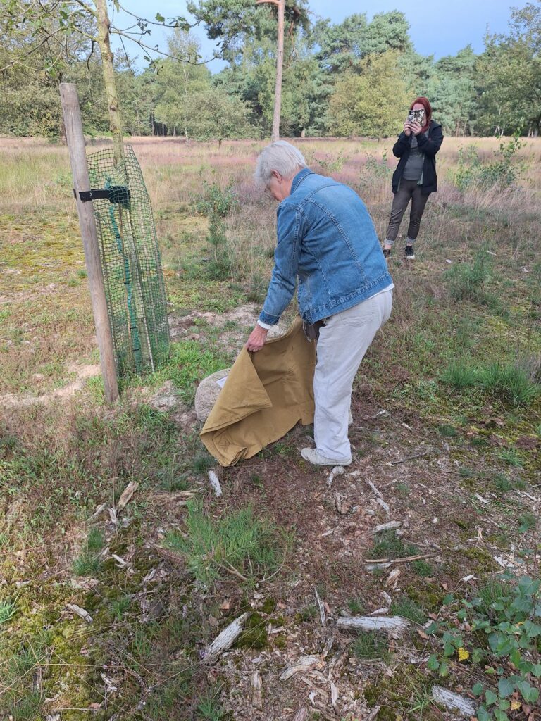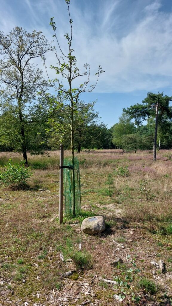 De zwerfsteen met het schildje is geplaatst voor een zomereik, die afgelopen voorjaar door Staatsbosbeheer is geplant.
