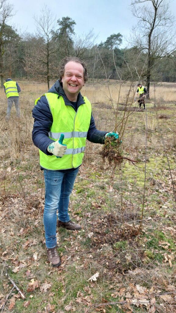 Dat boompjes verwijderen iets anders is dan achter een beeldscherm zitten bleek al gauw, de ene na de andere jas en trui gingen uit en er viel menig zweetdruppel.