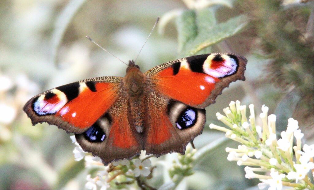 Na een poosje verpoppen de rupsen zich en dan verschijnt er een prachtige vlinder, de Dagpauwoog.
