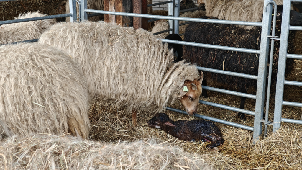 Het bijzondere was dat tijdens ons bezoek een lammetje geboren werd. We hebben de daadwerkelijke bevalling niet gezien want toen stonden we nog in de andere stal. Toen we hoorden over het pasgeboren lammetje, konden we wel direct gaan kijken. Als een lammetje geboren is dan duurt het ongeveer een minuut voor het lammetje kan staan. Voor de binding tussen de moeder en het kleintje is het belangrijk dat ze bij elkaar blijven. Ze leren elkaar dan herkennen aan de geur en het geluid. In de stal is er daarom een speciale kraamafdeling.