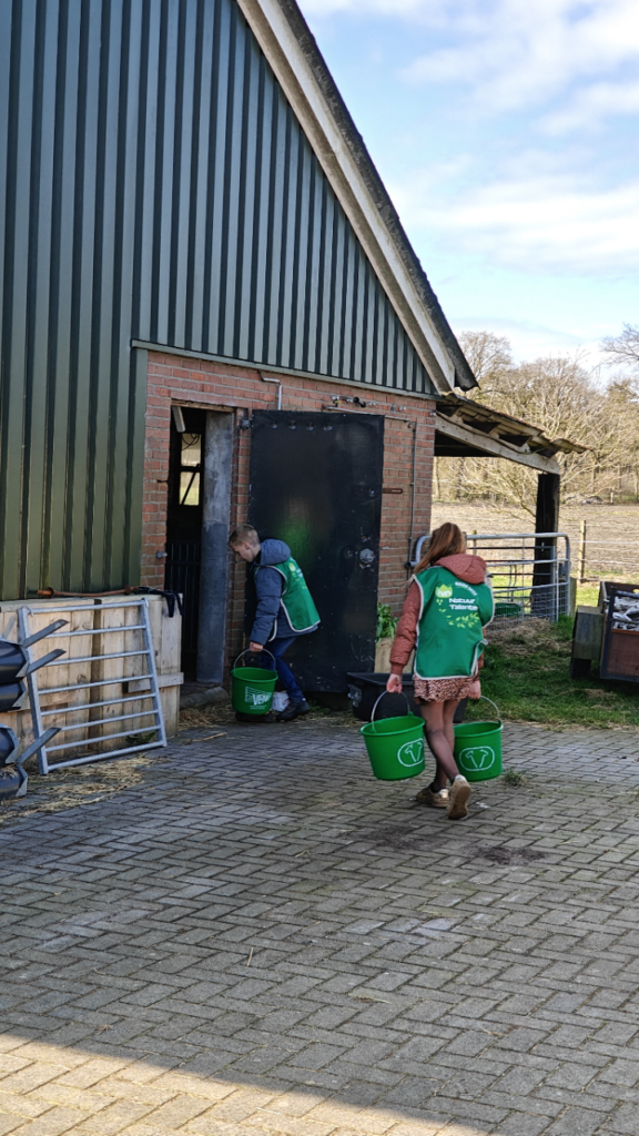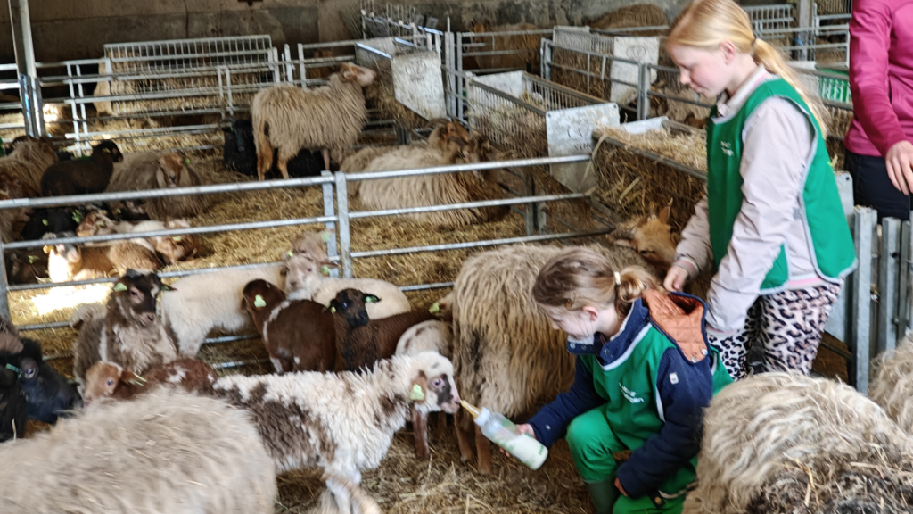 Om te vieren dat er zoveel lammetjes zijn geboren, werden we getrakteerd op beschuit met muisjes! Een leuke traktatie waar we lekker van genoten! Daarna konden de kinderen zelf aan de slag. Zoveel lammetjes betekent immers ook veel werk. Er werd met emmers water gesjouwd. Alle ruiven werden gevuld met hooi. En een aantal lammetjes mocht met de fles bijgevoerd worden. Heel erg leuk om te doen. Ook het logboek moest aangevuld worden met nieuwe informatie, zoals het oormerken van een lammetje en het hoknummer voor het pasgeboren lammetje